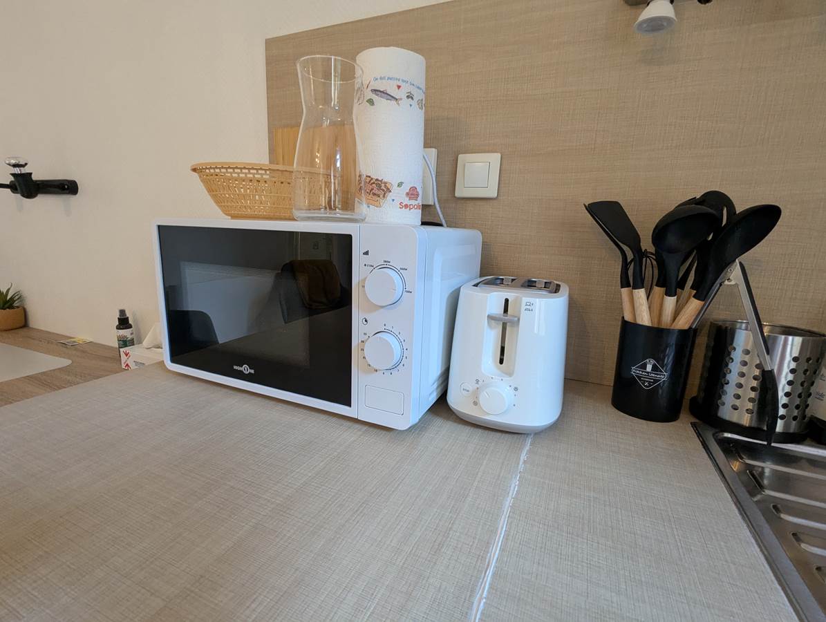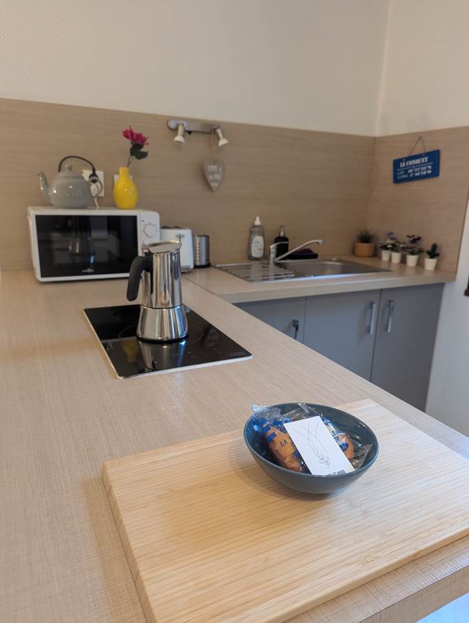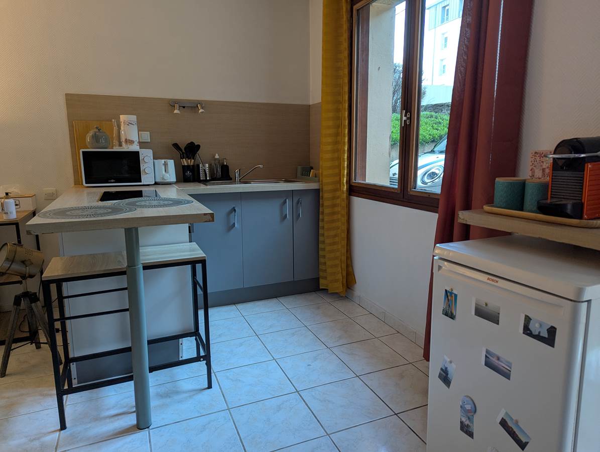 - Une kitchenette équipée : réfrigérateur top, plaques vitrocéramiques, évier, micro-ondes, grille-pain, cafetière Nespresso.